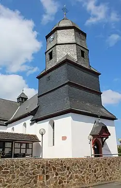 Der ehemalige Chorturm ist gegenüber dem Langhaus etwas eingezogen und erreicht eine Höhe von 25 Metern. Sein im Kern mittelalterlicher Unterbau aus Bruchsteinmauerwerk hat ein spätgotisches, spitzbogiges Ostportal unter einem verschieferten Vordach. Vermutlich wurde das Portal im Zuge des Westbaus hierher sekundär übertragen.[1] Ein Zeltdach leitet zu dem verjüngten, rechteckigen, verschieferten Fachwerkaufbau über,[10] dessen beide Geschosse durch ein umlaufendes, vorkragendes Gesimsband gegliedert sind. Die Gefache weisen Flechtwerklehm und Mannfiguren aus der Zeit um 1700 auf. Der zweigeschossige, achtseitige Aufbau dient als Glockenstube. In die vier Himmelsrichtungen sind kleine hochrechteckige Schallöffnungen für das Geläut eingelassen. Darüber sind im Norden und Süden die Zifferblätter der Turmuhr angebracht. Eine Welsche Haube bildet den Abschluss, die von einem Turmknauf, einem verzierten Kreuz und einem vergoldeten Wetterhahn bekrönt wird.