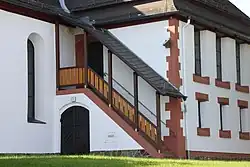 Das barocke Langhaus auf rechteckigem Grundriss wird durch Rundbogenfenster belichtet und von einem verschieferten Satteldach bedeckt. Der liegende Dachstuhl ist mit einem Hängewerk für die Flachdecke im Inneren konstruiert. Eine Tafel am Fuß der südlichen Turmwand trägt die Inschrift „+AO+1654“, was wahrscheinlich auf den Bau des Schiffes und der Turmhaube zu beziehen ist.[1] Auf die Erweiterung von 1905/1906 gehen das Querschiff und der westliche Rechteckchor zurück,[10] der eine nur geringe Tiefe aufweist. In der Westmauer des Chors ist ein großes segmentiertes Rundfenster in einer Rundbogennische eingelassen. Die Glasmalerei in der Mitte stellt Christus dar, der von acht ornamentierten Feldern umgeben wird. Das Querhaus hat ein verschiefertes Walmdach und wird durch hochrechteckige Fenster in zwei Zonen belichtet. Der Nordflügel wird an der Ostseite durch eine Tür mit Stichbogen erschlossen, über ihr führt eine überdachte Außentreppe zur Empore. Für den Südflügel wurde eine andere Lösung gewählt. Hier ist in der Südwestecke ein polygonaler Treppenturm mit achtseitigem Turmaufbau und gedrungenem oktogonalen Spitzhelm angebaut, dem südlich ein kleiner Vorbau für das Westportal mit Vordach angeschlossen ist. Ein kleines Vierungstürmchen hat an jeder Seite zwei Schallöffnungen und wird von einer geschwungenen Haube mit Turmknauf und Spitze abgeschlossen.