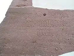 - Das dritte Epitaph ist genau bestimmbar. Ein Lilienkreuz wird von einer rundum angebrachten Inschrift in gotischen Majuskeln umrahmt. Sie lautet: „ANNO MCCCLXV.OB.KATHAERINA.DE.HORNBERG.XVI.KALENDAE.OCTOBRIS.“ zu deutsch: „Im Jahre des Herrn 1365 starb Katharina von Hornberg am 16. Oktober“. Vor der Reformation bestanden in Ebhausen zwei Pfründen zu St. Nikolaus und zu St. Katharina. Die zentrale Bestattung der Katharina von Hornberg gibt Anlass dazu, in ihr die Stifterin der Katharinenpfründe zu sehen.[12]