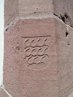 - Das erste Epitaph trägt keinen Namen und keine Jahreszahl, die Inschrift ist verwittert und stark abgeschliffen. Es ist jedoch ein Messkelch mit Hostie und ein Messbuch zu erkennen, was auf ein Grabmal eines Geistlichen aus vorreformatorischer Zeit schließen lässt. Neben den abgebildeten Attributen eines Geistlichen findet sich noch eine Art Backschaufel. Hier könnte der Familienname des Geistlichen angedeutet sein.