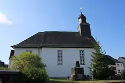 Die in etwa geostete Kirche ist an einer Straßenkreuzung im Ortszentrum aus weiß verputztem Bruchsteinmauerwerk inmitten eines Kirchhofs errichtet.[1] Das barocke Kirchenschiff auf rechteckigem Grundriss wird von einem verschieferten Satteldach bedeckt, dem im Westen ein vollständig verschieferter Dachreiter aufgesetzt ist. In den quaderförmigen Schaft sind drei Schallöffnungen mit Stichbogen für das Geläut eingelassen. Das sechsseitige Obergeschoss hat in abwechselnder Folge drei Schallöffnungen und drei Zifferblätter für die Turmuhr. Die kleine Welsche Haube wird von einem Turmknauf und einem verzierten Kreuz mit Wetterhahn bekrönt. Das Schiff wird an den Langseiten durch je zwei hohe Fenster mit flachem Stichbogen belichtet und durch ein schlichtes Rundbogenportal an der westlichen Schmalseite erschlossen. Über dem Portal ist ein kleines quadratisches Fenster eingelassen. Das westliche Giebeldreieck hat ein weiteres quadratisches Fenster zur Belichtung des Dachbodens und ist verschindelt, während die Ostseite verputzt und fensterlos ist.