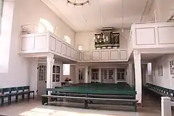 Der Innenraum wird von einer Flachdecke mit Rechtecken abgeschlossen. Im Westteil des Schiffes ist eine dreiseitig umlaufende, weiße Empore eingebaut, die auf viereckigen Holzpfosten mit Fase ruht. Die kassettierten Brüstungsfelder haben vergoldete Profile. Das schlichte, hölzerne Kirchengestühl in grüner Fassung füllt den Bereich zwischen den Emporen. Der ursprüngliche hochrechteckige Zugang zur Patronatsloge in der Ostseite ist ebenso wie das darüber eingelassene Fenster vermauert. Außen sind noch die Einfassungen erhalten.