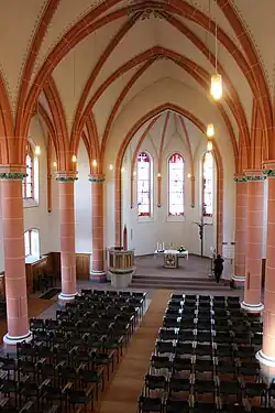 Das Innere wird durch Säulen, die ein Deckengewölbe tragen, in drei Schiffe, ein Mittelschiff und zwei Seitenschiffe, untergliedert. Der Altar, auf den ein Mittelgang vom Hauptportal im Westturm her hinführt, befindet sich in einer um drei Stufen erhöhten und ebenfalls gewölbten Chorapsis. Vor der nördlichen Seite des Triumphbogens, der Chor von Langhaus trennt, steht eine Kanzel. Im Westteil des Langhauses befindet sich eine Empore, auf der die Orgel aufgestellt ist. Die Möglichkeit zum Einbau von weiteren Emporen entlang der Seitenwände des Langhauses war bei der Planung des Baus berücksichtigt worden, wurde aber nicht ausgeführt.[4]