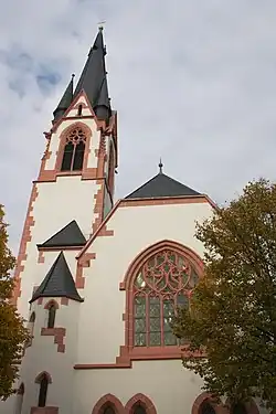 Die Emporenkirche erhebt sich auf annähernd kreuzförmigem Grundriss, wobei jedoch der Kreuzesarm auf der Südostseite nur durch einen etwas vorstehenden Giebel angedeutet ist. Über diesem ist das Dach wie auch bei den übrigen Giebeln auf der Ost- und Westseite abgewalmt. Lediglich der nordwestliche Giebel reicht bis zum Dachfirst und wird von einer Kreuzblume geschmückt. Die Kirche wird überragt von einem Turm mit spitzen Pyramidendach. Von den weißen Wandflächen sticht die in rotem Sandstein ausgebildete Architekturgliederung ab.