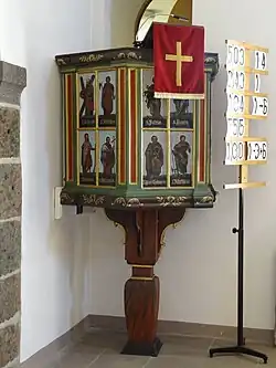 Die achteckige hölzerne Kanzel aus dem 18. Jahrhundert, die im Jahr 1733 bereits vorhanden war oder eingebaut wurde, hat in den drei Kanzelfeldern jeweils vier Füllungen mit Darstellungen der zwölf Apostel.[4] Das barocke Altarkreuz ist ein Kruzifix des Dreinageltypus, das seit 1961 wieder am Altar angebracht ist. Die beiden Leuchter wurden 1879 gefertigt. Das moderne Gestühl lässt einen Mittelgang frei. Rechts der Kanzel fand ein Grabstein seinen Aufstellungsort. Er trägt die Inschrift: „Leich Text im … Lazarus unser Freund schläft; aber ich gehe hin, daß ich ihn aufwecke. Da sprachen seine Jünger, schläft er, so wird es besser mit ihm.“ (Joh 11,11–12 ).[15]