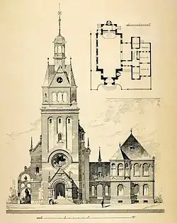 Die Kirche geht in ihrem Ursprung auf einen Entwurf des Kölner Architekten Emil Schreiterer (1852–1923; Architekturbüro Schreiterer & Below) zurück. Die Einweihung der Saalkirche mit vorgesetztem Turm und angebautem Pfarrhaus erfolgte am 28. November 1895. In den letzten Kriegsmonaten des Zweiten Weltkriegs wurde das Ensemble bis auf den Kirchturm durch Fliegerbomben zerstört. Beim Wiederaufbau ab 1951 wurde der Turm mit veränderter Turmspitze erhalten. Das Kirchenschiff wurde zweigeschossig angelegt. Der Gottesdienstraum befindet sich im Nachkriegsbau im Obergeschoss, während im Erdgeschoss Raum für einen großen Gemeindesaal geschaffen wurde. Die Einweihung der wiedererrichteten Kirche wurde am 6. Dezember 1953 gefeiert.
