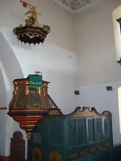 Der ehemals runde Triumphbogen wurde später spitzbogig erhöht, um genügend Raum für die Orgel zu bieten. Die bauchig geschwungene, polygonale, hölzerne Kanzel eines unbekannten Künstlers am südlichen Chorbogen ist aufwändig geschnitzt und hat einen zierlichen Schalldeckel, auf dem ein Trompete blasender Engel steht. Unterhalb des Schalldeckels schwebt eine weiße Taube. Der vergitterte Pfarrstuhl führt zum Kanzelaufgang. Ihm entspricht in der Ecke auf der linken Seite vor dem Bogen der verglaste Patronatsstuhl für den Grafen von Laubach.[9] Die Füllungen und die geschwungenen Bekrönungen sind mit Blumen bemalt, die ebenfalls Daniel Hisgen zugeschrieben werden.[18] Das hölzerne Kirchengestühl mit geschweiften Wangen und gemaltem Blumendekor lässt einen Mittelgang frei. Der Kronleuchter datiert von 1904.