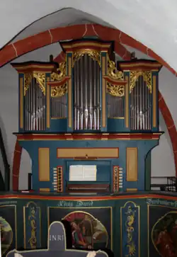 Im Zuge einer Instandsetzung durch Förster & Nicolaus 1953 wurde die Gambe 8′ durch ein Quintatön 8′ ersetzt. 1977 folgte eine Restaurierung durch dieselbe Firma, die den Principal 4′ erneuerte. Das Instrument verfügt über 13 Register, die sich auf einem Manual und Pedal verteilen. Neben den beiden ausgetauschten Registern wurde der vierte Chor der Mixtur erneuert. Das übrige Pfeifenwerk ist alt. Die Disposition lautet wie folgt:[20]