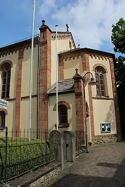 Die nicht exakt geostete, sondern parallel zur Kirchstraße ausgerichtete Kirche in Verlängerung des Goetheplatzes ist in der Ortsmitte aus Bruchsteinmauerwerk errichtet. Sie steht auf einem Kirchengelände, das teilweise von Bruchsteinmauern umgeben ist.[1] Das Mauerwerk, dessen Steine aus örtlichen Steinbrüchen stammen, ist seit 1978 in einem gelblichen Farbton verputzt, wobei Gliederungselemente wie Friese, Gesimse, Lisenen, Pilaster, Maßwerk und Bögen vom Verputz ausgespart sind. In stilistischer Hinsicht weisen Bögen und Fenster der Kirche auf den Rundbogenstil.[8]