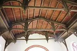 Der Innenraum wird durch einen offenen Dachstuhl abgeschlossen, dessen verbretterte Konstruktion auf Wandstielen als Konsolen ruht. Die Ankerbalken sind mit Holzzapfen verziert. Im Chor tragen kleine Konsolen das Chorgewölbe. Ein großer Rundbogen öffnet den um zwei Stufen erhöhten Chor zum Schiff. Er trägt den Bibelvers: „Jesus Christus gestern und heute und derselbe auch in Ewigkeit“ aus Heb 13,8 . Die Kirchenausstattung ist weitgehend bauzeitlich.[18] Der Fußboden ist mit Steinplatten belegt, während sich unterhalb des Kirchengestühls ein Holzboden befindet. Das Gestühl aus Tannenholz lässt einen Mittelgang frei.[8]