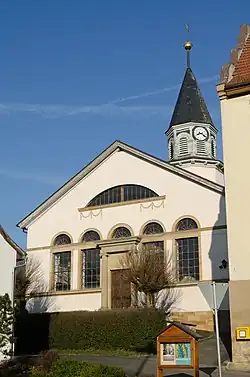 Die klassizistische Querkirche wurde 1819 an Stelle eines Vorgängerbaus von 1658 nach einem Entwurf von Bernhard Morell unter Einbeziehung des alten Kirchturms gebaut. Der ursprüngliche Zustand wurde bei der Restaurierung 1896 wieder hergestellt. Ihr achteckiger Kirchturm an der nordwestlichen Breitseite des mit einem flach geneigten Satteldach bedeckten Kirchenschiffs hat ein eingezogenes Geschoss, das die Turmuhr und den Glockenstuhl beherbergt, und einen achtseitigen, schiefergedeckten spitzen Helm. Das von zwei Säulen eingerahmte, und von jeweils zwei Bogenfenstern flankierte Portal an der Südostseite, wird über eine breite Freitreppe erreicht. Das mit zweigeschossigen Emporen ausgestattete Kirchenschiff ist mit einem hölzernen Tonnengewölbe überspannt. Zur Kirchenausstattung gehören eine Mensa, die schon im Vorgängerbau stand, die Kanzel und die Orgel, die über drei Ebenen in der Mittelachse des Kirchenschiffs angeordnet sind.