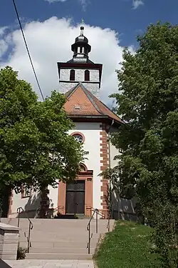 Die Saalkirche wurde 1740 von Helfrich Müller gebaut. Das langgestreckte Kirchenschiff ist sowohl im Osten als auch im Westen dreiseitig abgeschlossen. Aus dem Satteldach des Kirchenschiffs erhebt sich im Westen ein quadratischer, mit einer achteckigen Laterne versehener Dachreiter, in dem eine Kirchenglocke hängt, die 1582 von Laux Rucker gegossen wurde. Die Gestaltung des Innenraums erfolgte 1765/66. Die Malereien, u. a. an den Brüstungen der umlaufenden Emporen, hat Johann Friedrich Hoffmann ausgeführt. Die Orgel mit 7 Registern, einem Manual und einem Pedal wurde 1842 von Friedrich Wilhelm Bernhard gebaut. Sie steht auf der Empore über dem Altar.