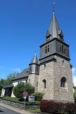 Der ursprünglich wehrhafte Kirchturm auf quadratischem Grundriss ist ungegliedert. Die Turmhalle mit ihrem Kreuzgewölbe wird an den drei freistehenden Seiten durch Fenster mit stumpfem Spitzbogen belichtet, die seit den Erneuerungsmaßnahmen von 1899 geweitet sind und Fensterstürze und schräge Sohlbänke aus hellem Werkstein erhalten haben. Im Obergeschoss sind drei Schlitzfenster eingelassen, deren Fensterstürze Kleeblatt-Nischen haben. Unterhalb der Traufe springt im Süden und Norden das Mauerwerk etwas zurück und wird dort von einem kleinen Schieferdach bedeckt. Dem massiv aufgemauerten Turmschaft ist ein kubusförmiges, verschiefertes Obergeschoss in Fachwerkweise aufgesetzt, über dem sich der Turmhelm erhebt. Der vierseitige Spitzhelm mit abgeflachten Ecken trägt die vier Zifferblätter der Turmuhr unter einem Dreiecksgiebel. Er erreicht eine Höhe von 28 Metern und wird von einem Turmknauf, einem verzierten Kreuz und einem Wetterhahn bekrönt. Ein polygonaler Treppenturm des 19. Jahrhunderts an der Südseite zwischen Turm und Schiff hat Schlitzfenster in der Art des Turmobergeschosses und ein verschiefertes Obergeschoss, dem ein oktogonaler Spitzhelm aufgesetzt ist.