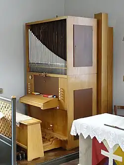 In die Vorgängerkirche wurde 1795 eine Orgel eingebaut. Lehrer Bernges reparierte das Instrument, das bald wieder reparaturbedürftig war und nicht in die neue Kirche übernommen wurde. Dort wurde 1863 ein Harmonium eingeweiht, das fortan den Gesang begleitete. Im Jahr 1978 erwarb die Gemeinde ein kleines gebrauchtes Orgelpositiv aus Mümling-Grumbach, das in der Nordostecke aufgestellt wurde. Die Firma Walcker baute das Instrument mit mechanischer Traktur im Jahr 1962. Es verfügt über fünf geteilte Register auf einem Manual und ein Pedalregister. Die Disposition lautet wie folgt:[8]