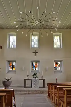 Die bunten Bleiglasfenster sowie das Kruzifix und die Leuchter auf dem Altartisch stammen von Jürgen Brodwolf.