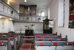 Eine Flachdecke schließt den schlicht gestalteten Innenraum ab. An der West- und der Nordwand ist eine Winkelempore mit kassettierten querrechteckigen Füllungen eingebaut.[1] Die Ostempore ist etwas niedriger und dient als Aufstellungsort für die Orgel. Der Fußboden ist mit Fliesen in verschiedenen Grautönen belegt. Einige alte Inventarstücke der Kirchenausstattung sind erhalten.