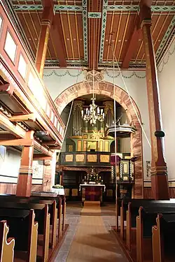 Der Innenraum des Schiffs wird von einer flachen Holzbalkendecke abgeschlossen,[12] die auf einem Längsunterzug ruht. Zwei schlanke Säulen mit Bügen vor dem Chorbogen stützen den Dachreiter. Die hölzerne Flachdecke im Chor ist mit Sternen bemalt. Der Fußboden ist mit Platten aus Rotsandstein belegt. Im Bereich des Kirchengestühls befinden sich Holzdielen. Eine hölzerne Winkelempore mit kassettierten Füllungen ist an der West- und Nordseite des Schiffs eingebaut. Sie ruht auf viereckigen Pfosten mit Fasen und Bügen. Die Orgel hat ihren Aufstellungsort auf der konvexen Ostempore im Chor gefunden.