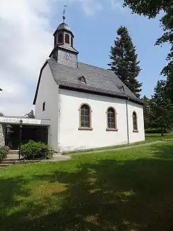 Die in etwa geostete, weiß verputzte Saalkirche auf rechteckigem Grundriss ist am östlichen Ortsrand errichtet. Der dreieckige Kirchhof wird von einer Mauer aus Bruchsteinmauerwerk eingefriedet.[8]
