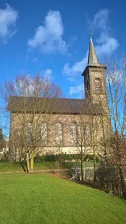 Die steinsichtige Saalkirche ist nicht geostet, sondern nach West-Nordwest ausgerichtet. Sie ist über einem vorspringenden Sockel errichtet und wird von einem Satteldach bedeckt. Die Giebelseiten werden durch einen Fries verziert. In der westlichen Giebelspitze ist ein Drillingsfenster eingelassen. Die oberen zwei Drittel der Westseite werden durch Lisenen gegliedert. In der Südwestecke ist ein kleines Rundbogenportal eingelassen, das dem Pfarrer den direkten Zugang in den Altarbereich gewährt.