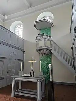 Der Altar, die Kanzel und das steinerne Taufbecken bilden das liturgische Zentrum der Kirche. Der schlichte Holzaltar stammt aus der Bauzeit und wurde mehrfach überarbeitet, zuletzt 1974. Die Kanzel, ebenfalls aus Holz gefertigt, wurde im Rahmen der Renovierung 2006 farblich neu gestaltet.[2]