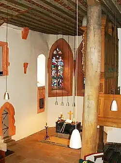 In der Kirche steht die älteste erhaltene Orgel der Orgelbauerfamilie Stumm. Sie wurde von 1723 von Johann Michael Stumm als einmanualiges Instrument mit 13 Registern und hinterspieliger Traktur erbaut. 1910 wurde sie vergrößert und 1934 von der Firma Oberlinger mit elektrischer Traktur versehen, umgebaut und erneut erweitert. Beispielgebend für viele spätere Orgelrestaurierungen wurde die Orgel 1979 von der Firma Johannes Klais Orgelbau in den ursprünglichen Zustand zurückversetzt. Dabei wurde die mechanische Traktur und die originale Disposition wiederhergestellt.[4][5] Das Instrument steht rechts oberhalb des Altars auf einer Eichenholzempore. Der Orgelprospekt weist Arkantusschitzereien als Schleierwerk auf. Die Disposition lautet:[6]