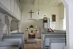 Die im Kern romanische Saalkirche aus Bruchsteinen wurde im 17. Jahrhundert erneuert. Aus dem Satteldach des Kirchenschiffs erhebt sich im Westen ein quadratischer, schiefergedeckter Dachreiter, der mit einem Pyramidendach bedeckt ist. Der mit einer Kassettendecke überspannte Innenraum hat eine L-förmige Empore, auf ihrer Schmalseite steht die Orgel. Zur Kirchenausstattung gehören ein Altar, eine Kanzel und ein Taufbecken.
