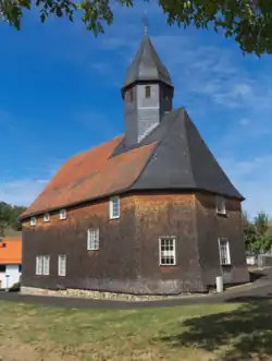 Die mit Schindel verkleidete Fachwerkkirche wurde 1672/1673 an Stelle eines Vorgängers gebaut. Das Kirchenschiff hat einen dreiseitigen Schluss. Aus dem Satteldach erhebt sich im Bereich des Chors ein achteckiger, schiefergedeckter Dachreiter.