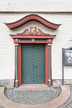 Die Kirche wird durch drei hochrechteckige Portale erschlossen. Während die Portale an den Langseiten schlicht ausgeführt sind, ist das Südportal repräsentativ gestaltet. Zwei Freisäulen tragen einen Architrav, über dem das prächtige Wappen derer von Riedesel angebracht ist. Das Südportal war ursprünglich an der Westseite angebracht, wurde wegen der angrenzenden Bundesstraße aber verlegt.[6]