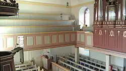 Im Turm führen zweiläufige Treppen zu den dreiseitig umlaufenden Emporen, die auf Pfeilern ruhen. Ältestes Inventarstück ist ein hölzerner Opferstock aus dem Jahr 1687, der aus der Vorgängerkirche übernommen wurde.[17] Die Orgel ist mittig auf der Nordempore aufgestellt. Ihr gegenüber ist die holzsichtige Kanzel vor einer marmoriert angemalten Kanzelwand angebracht.[2] Deren rot-blaue Marmorierung aus der Erbauungszeit der Kirche wurde 1971 freigelegt. Profilierte Gesimse gliedern die Wand, die in den Ecken von quadratischen Fenstern durchbrochen wird, in drei Ebenen. Die polygonale Kanzelkorb verbreitert sich nach unten und wird unten und oben von umlaufenden profilierten Gesimskränzen abgeschlossen. Die Kanzelfelder weisen kassettierte Füllungen auf, die mit Goldfarbe abgesetzt sind. Der achteckige Schalldeckel wird von durchbrochenem Schnitzwerk und geschwungenen Bögen verziert, die in einem vergoldeten Kugelkreuz enden.