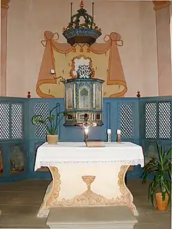 Die Stumm-Orgel von 1861 auf der Westempore mit klassizistischem Gehäuse, Schleifladen und mechanischer Traktur verfügt über 10 Register, die auf ein Manual und Pedal verteilt sind. 1985/86 erfolgte eine Renovierung, Wiederinstandsetzung und Umsetzung von der Ost- auf die Westempore durch die Firma Orgelbau Weimbs.[7][8]