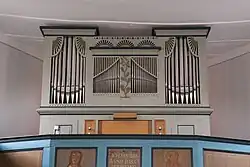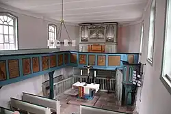 Der Innenraum wird durch eine Flachdecke abgeschlossen. An den beiden Ostseiten ist eine Winkelempore eingebaut, die auf Holzpfosten mit Bügen ruht. Die Empore im Chor dient als Aufstellungsort für die Orgel und kragt trapezförmig leicht nach vorne. Die Füllungen der kassierten Brüstung tragen Malereien aus der Zeit um 1780, die elf Apostel mit ihren Attributen, Christus als Salvator mundi, den Sündenfall, die Kreuzigungsgruppe und Johannes den Täufer mit sechs Fingern zeigen. Die schlichten Darstellungen im bäuerlichen Stil sind wenig plastisch und nicht proportional; als Vorlage haben wahrscheinlich die Malereien in der Kirche von Bellnhausen gedient.[9] Die Schrifttafel über dem Altar trägt den Bibelvers aus Offb 1,8 und die Tafel in der Mitte der Langseite das Jesuswort aus Joh 6,69 . Eine Tafel ist mit einem Blumengebinde bemalt.