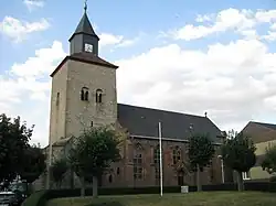 Der romanische Kirchturm aus Bruchsteinen mit Stützpfeilern im Westen stammt aus dem 12. Jahrhundert. Er gehörte ursprünglich zu einer Wehrkirche, wie an den Schießscharten zu erkennen ist. In den Turm wurden Biforien als Klangarkaden eingebrochen, hinter denen sich der Glockenstuhl befindet. Der Turm erhält 1792 einen achteckigen schiefergedeckten Aufsatz, der die Turmuhr beherbergt. Darauf sitzt ein Zeltdach. Am 18. März 1883 wurde das neugotische Kirchenschiff und der querrechteckige, eingezogene Chor aus Quadermauerwerk, deren Wände durch Strebepfeilern gestützt werden, eingeweiht. Der Innenraum des Kirchenschiffs ist mit Zugankern versehen und mit einer Flachdecke unter den Dachbindern überspannt. Der Chor hat ein Kreuzrippengewölbe. Die Orgel mit 12 Registern wurde 1882–1884 von den Gebrüdern Euler gebaut. Das Taufbecken trägt die Jahreszahl 1624.