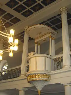 Der Kanzel, die hoch in die Westempore einbezogen ist, stehen an der Ostseite Altar und Orgel auf der Mittelachse gegenüber. Die halbkreisförmige Kanzel hat fünf schlichte Füllungen über einem reich verzierten Fries mit vergoldeten Voluten, Muscheln und Akanthusblättern. Der Schalldeckel ruht auf zwei runden und zwei viereckigen Säulen korinthischer Ordnung und ist mit einem Kranz aus vergoldeten Blättern verziert. An seiner Unterseite ist eine vergoldete Taube, Symbol für den Heiligen Geist, angebracht. Ein die Taube umgebender Strahlenkranz wurde später übermalt. Der konkave Orgelprospekt wird durch Pilaster in fünf Felder gegliedert. Unterhalb der Orgel steht der Blockaltar mit schwarzer Marmorplatte um zwei Stufen erhöht. Das Altarkreuz und die beiden Leuchter sind aus Gusseisen gefertigt und stammen vermutlich von 1830.[19]
