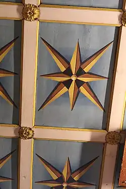 Der Innenraum ist 25,26 Meter lang und 13,25 Meter, im Bereich des Risalits 16 Meter breit. Er wird von einer flachen Kassettendecke abgeschlossen, die mit 666 vergoldeten Sternen auf blauem Untergrund ausgemalt ist. Jede Kassette umfasst neun achtzackige Sterne, die wahrscheinlich mit einer Schablone gezeichnet wurden. Die dezent integrierten Eisernen Kreuze im Zentrum der Sterne wurden später übermalt und sind nur oberhalb der Orgel erhalten.[11] Der Fußboden ist mit roten Sandsteinplatten belegt. Die Kirchenausstattung stammt überwiegend aus den 1830er Jahren. Ihre weiße Farbe mit Vergoldungen verleiht dem Raum eine vornehme Wirkung. Durch die vierseitig umlaufende Empore ist der großzügige Innenraum zweigeschossig gestaltet. Sie ruht auf 20 toskanischen Säulen, die oberhalb der Empore in 18 kannelierte korinthische Holzsäulen übergehen und die Unterzüge tragen.[12] Zwei Säulen fehlen dort, wo die Orgel aufgestellt ist. Die Empore springt an dieser Stelle, einer Apsis vergleichbar, konkav zurück und betont den Altarbereich.[18]