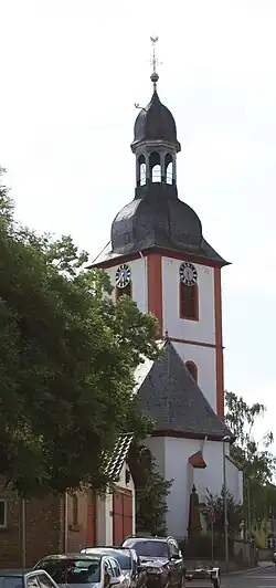Der letzte Vorgängerbau von 1649 wurde, weil er viel zu klein und auch baufällig geworden war, ab 1718 unter teilweiser Verwendung seiner Teile durch einen Neubau ersetzt. Zunächst wurde das Kirchenschiff errichtet, dann der gotische Chor nach Süden verbreitert. 1738 wurde dem Kirchturm, der im Nordosten des Kirchenschiffs steht, eine schiefergedeckte gebauchte Haube mit Laterne aufgesetzt. Damit war die Saalkirche vollendet. Das oberste Geschoss des Kirchturms beherbergt die Turmuhr und hinter den Klangarkaden den Glockenstuhl, in dem drei Kirchenglocken aus Eisenhartguss hängen, die 1923 als Ersatz für die im Ersten Weltkrieg abgelieferten Glocken von Schilling & Lattermann gegossen wurden. Das Erdgeschoss des Turms, in dem sich ein Sakramentshaus und eine Piscina befinden, ist mit einem Kreuzgratgewölbe überspannt.