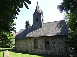 Die Maße des Langhauses basieren auf dem römischen Fuß, was eine Erbauungszeit vor dem 13. Jahrhundert nahelegt.[10] Das Langhaus ist genau 37 römische Fuß lang und 27 römische Fuß breit.[3] Es wird durch Portale an der West- und Südseite erschlossen. Das unregelmäßige Gewände des Südportals geht auf wiederverwendete Teile eines breiteren romanischen Portals zurück. Drei kleine Rundfenster an der Südseite und zwei große Rundbogenfenster an der Nordseite von 1950 belichten den Innenraum. Statt des Emporenzugangs an der Südseite wurde in den 1960er Jahren ein Rundfenster eingelassen.[7] Dem Satteldach ist ein Dachreiter aufgesetzt. Der hohe, verschieferte, quadratische Schaft hat an jeder Seite sehr kleine Schalllöcher für das Geläut. Vier Dreiecksgiebel leiten zu dem vierseitigen Spitzhelm über, der von Turmknauf und Wetterhahn bekrönt wird. Der Dachreiter beherbergt ein Vierergeläut. Die älteste Glocke datiert von 1770. Sie wurde von Freiherr Johann Jacob von Zwierlein gestiftet und von Johann Philip Henschel in Gießen gegossen.[11]