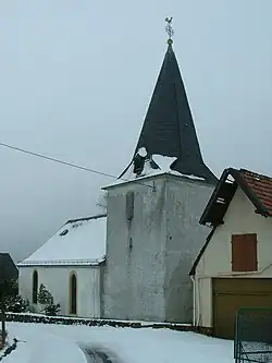 Die heutige Kirche ist ein Bruchsteinbau mit einem angebauten Turm innerhalb des ehemaligen Kirchhofs etwas über dem Dorf.