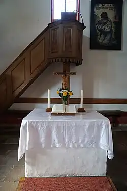 Der aufgemauerte Blockaltar ist weiß verputzt und hat eine überstehende Mensaplatte, auf dem ein kleines Kruzifix des Dreinageltypus aufgestellt ist. Die Gemeinde hatte es 1878 aus Stettin gekauft und durch den örtlichen Schreiner mit einem Holzkreuz versehen lassen. Dahinter ist unter dem Westfenster die Kanzel auf einem viereckigen Fuß aufgestellt. Der linksläufige Kanzelaufgang hat rhomboide und der polygonale Kanzelkorb hochrechteckige Füllungen, die marmoriert bemalt sind. In der Südwestecke ist ein Pfarrstuhl eingebaut, der in der oberen Hälfte durchbrochenes Rautenwerk hat und der den Zugang zur Kanzeltreppe ermöglicht.[9]