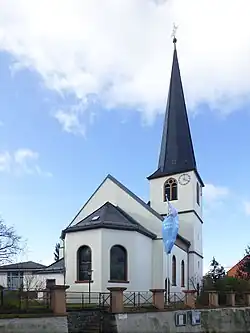Spätestens seit dem 12. Jahrhundert ist eine Kapelle an diesem Ort bezeugt, die sich dort stand, wo sich heute der Chor befindet. Sie wurde um 1466 zum kreuzrippengewölbten Chor mit 5/8-Schluss erweitert. Ihm wurde 1571 zunächst ein breiteres Kirchenschiff asymmetrisch angefügt, das 1604/05 zu den heutigen Maßen ausgebaut wurde. Der Kirchturm an der Nordwestecke des Kirchenschiffs besteht baugeschichtlich aus zwei Teilen. Seine beiden unteren Geschosse gehörten bereits zu einer Wehrkirche. 1801 wurden sie auf den alten Fundamenten wiederaufgebaut und um ein Geschoss aufgestockt, das die Turmuhr und hinter den Klangarkaden den Glockenstuhl mit drei Kirchenglocken aufnimmt. Lange Jahre hing nur die 1511 gegossene Glocke im Turm. Erst in den 1950er Jahren wurden zwei weitere Glocken ergänzt, nachdem der Glockenstuhl erneuert worden war. Bedeckt ist der Turm mit einem achtseitigen, schiefergedeckten spitzen Helm.