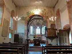 In der Apsis sind fünf Personen des Alten Bundes dargestellt: Moses, König David, Elias, Noah und Abraham. Darüber sind fünf musizierende Engel und schließlich Gottvater abgebildet, der die Erdkugel in seinen Händen trägt. In der Decke sind zwischen den Kreuzrippen die Symbole der vier Evangelisten gemalt worden: der Stier für den hl. Lukas, der Adler für den hl. Johannes, der Löwe für Markus und der Mensch für Matthäus.