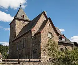 Die annähernd geostete Chorturmkirche ist im Ortszentrum aus unverputztem Bruchsteinmauerwerk errichtet. Der ungegliederte Chorturm auf quadratischem Grundriss ist gegenüber dem Schiff eingezogen. Er dient seit 1916 als Haupteingang und wird durch ein Rundbogenportal an der Ostseite erschlossen. Die drei Geschosse erhalten durch sehr kleine Rundbogenfenster Licht. Die Turmhalle hat ein Kreuzgratgewölbe und Sitznischen. Das Opus spicatum aus Flusskieseln im Turmboden weist auf den romanischen Ursprung des Turms.[8] Ein großer Spitzbogen öffnet die Turmhalle zum Langhaus. Das Rundfenster im Süden entwarf der Maler Martin aus Wiesbaden im Jahr 1916. Es stellt einen Ritter mit Rüstung, Schwert und einem Wappenschild mit einem Adler dar. Unterhalb der Traufe sind seit 1981 an allen vier Seiten Zifferblätter von vier elektrisch betriebenen Uhren angebracht. Dem verschieferten Pyramidendach sind vier kleine Gauben mit Dreiecksgiebeln aufgesetzt. Es wird von einem Turmknauf und einem verzierten Kreuz mit Wetterhahn bekrönt.