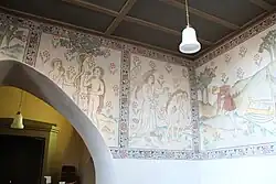 Die polychromen Einzelszenen der spätgotischen Fresken werden durch viereckige, friesartige Rankenbänder umrahmt, die auf schwarzem Hintergrund einen weißen Stab mit weißen Blättern und sechsblättrigen roten Blüten hat.[10] An der original erhaltenen Nordwand sind als Malereien die Verkündigung des Herrn, Christi Geburt, die Anbetung der Heiligen Drei Könige vor dem Stall in Bethlehem und Christophorus mit dem hl. Antonius und der Ballersbacher Mühle dargestellt. Die vier Szenen aus der Schöpfungsgeschichte, die ursprünglich darüber angebracht waren und nun an der Ostwand zu sehen sind, zeigen die Erschaffung von Adam und Eva, den Sündenfall, die Vertreibung aus dem Paradies und die Darstellung von Adam mit dem Spaten bei der Feldarbeit Eva beim Wolle Spinnen. Von der Südwand auf den Westchor wurden die figurenreiche Kreuztragung und Kreuzaufrichtung mit der Verspottung Jesu übertragen.[11]