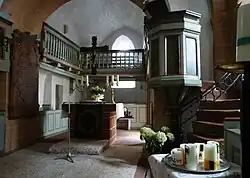 Das Schiff ist zwischen rechteckigen Gurt- und Scheidbögen kreuzgratgewölbt. Die schmalen Querhausarme sind mit Tonnengewölben ausgestattet. Die vermauerten Arkaden sind an der Nordseite außen und innen erkennbar und dienen heute im oberen Bereich als Fenster. Die ehemaligen breiten Pfeiler haben Kämpfergesimse, die zum Teil mit Schuppen und Zahnfries verziert sind.[6] Aus romanischer Zeit sind außen an der Kirche kleine romanische Steinplastiken erhalten.[7] Am Nordgiebel ist in einem Muldenrelief unter einem schmalen Giebelchen ein Ritter dargestellt, daneben ein vorkragender Männerkopf, an der Ostseite des Südarms ein Männerkopf in einem Relief.[4] Außentreppen ermöglichen von Westen den Zugang zu den Emporen. In unterschiedlicher Höhe belichten Fenster unterschiedlicher Form und Größe das Schiff.