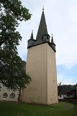 Der hohe, ungegliederte Wehrturm ist abgesehen von einem später eingebrochenen rundbogigen Südfenster fensterlos. An der West- und Südseite sind je zwei schlitzförmige Schießscharten erhalten.[8] Er hat ein gewölbtes Turmerdgeschoss, das ausschließlich vom Schiff aus zugänglich ist. Die Turmhalle öffnet sich zum Schiff in einer rundbogigen Tür mit abgetrepptem Gewände. Ein spätgotischer schlanker achtseitiger Spitzhelm ist vollständig verschiefert und wird von einem Turmknauf, einem Kreuz und einem Wetterhahn bekrönt. Dem Turmhelm sind an den Ecken vier polygonale Wichhäuschen aus Fachwerk aufgesetzt, die ein rundbogiges Schallloch haben und von einer Spitze verziert werden. Die Glockenstube beherbergt ein Dreiergeläut. Die älteste Glocke, die „Alphabetglocke“, stammt aus dem 14. Jahrhundert. Der Gießer hat die beabsichtigte Buchstabenfolge der Umschrift in falscher Richtung, nämlich rückläufig und zum Teil spiegelschriftlich aufgelegt. Eine weitere mittelalterliche Glocke wurde 1855 ersetzt. Die dritte Glocke von 1685 wurde 1917 zusammen mit der von 1855 für Rüstungszwecke abgeliefert. Die 1922 als Ersatz gegossenen Glocken wurden 1941 abgeliefert und 1951 beide ersetzt.[8]