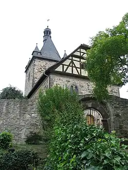 In das Rundbogenportal des Wehrkirchhofes ist ein jüngeres Renaissanceportal von 1594 eingestellt.