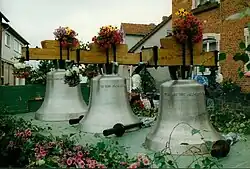 Die Kirche beherbergt ein Dreiergeläut. Mitte des 19. Jahrhunderts waren eine Glocke von Johann Peter Bach (Windecken 1763), von Johannes und Andreas Schneidewind (Frankfurt 1714) sowie eine mittelalterliche Glocke, die aus dem Kloster Arnsburg übernommen war, vorhanden.[13] Zwei gesprungene wurden 1896 durch Glocken von Franz Schilling und Karl Friedrich Ulrich ersetzt und mussten im Ersten Weltkrieg als Metallspende abgegeben werden. Die dritte Glocke, die Friedrich Otto in Gießen 1855 umgegossen hatte, wurde 1920 verkauft. Mit dem Erlös wurden im selben Jahr drei Stahlglocken angeschafft, die als Gemeinschaftsarbeit von Buderus und Rincker entstanden.[14] Die größte (1,10 Meter Durchmesser) hatte den Schlagton gis1 und trug die Inschrift: „In schwerer Zeit dem Herrn geweiht, Herr hilf und jetzt und in Ewigkeit.“ Die zweite (0,86 Meter Durchmesser) mit dem Schlagton h1 hatte als Inschrift: „Gerechtigkeit erhöht ein Volk, aber die Sünde ist der Leute Verderben.“ Die dritte (0,76 Meter Durchmesser) mit cis2: „Wer aber beharret bis ans Ende, der wird selig.“[15] Damit waren die Glocken im Te Deum-Motiv gestimmt. Das Geläut wurde 1962 elektrifiziert. Im Jahr 1993 wurden die Stahlglocken aus klanglichen Gründen vom Turm geholt und durch drei Bronzeglocken der Firma Rincker im gleichen Motiv, aber der um einen Halbton höheren Tonfolge a1-c2-d2, ersetzt.