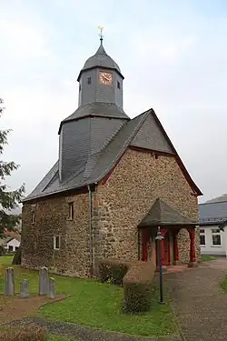 Das Schiff auf rechteckigem Grundriss (8,32 × 12,32 Meter) hat ein Satteldach mit einem mächtigen, achteckigen, verschieferten Dachreiter, der mittig aufgesetzt ist. Der Unterbau des Dachreiters beherrscht das Satteldach und reicht fast bis zur Traufe. Pultdächer vermitteln zu dem kleineren Obergeschoss, das als Glockenstube dient. Dort sind fünf kleine rundbogige Schalllöcher und Richtung Westen das Zifferblatt der Turmuhr angebracht. Eine geschwungene Haube wird von Turmknauf, schmiedeeisernem Kreuz und Wetterhahn bekrönt.[1] Die Spitzen der beiden Dreiecksgiebel sind verschiefert. Das Schiff wird an der Nordseite von drei kleinen Rechtfenstern und an der Südseite durch fünf kleine Rechteckfenster unterschiedlicher Größe und in unterschiedlicher Höhe belichtet.[6] Das spitzbogige Südportal mit grober Fase ist aus rotem Sandstein gefertigt. Das leicht spitzbogige Westportal mit Sandsteingewände hat einen hölzernen Vorbau, der am rechten Pfosten mit der Jahreszahl 1920 bezeichnet ist.[1] Das verschieferte Dach wird durch drei Holzpfeiler im Mittelschiff gesichert.