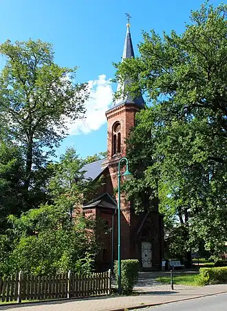 Bei der evangelischen Kirche in Gröditz handelt es sich um einen im neuromanischen Stil errichteten Klinkerbau aus dem 19. Jahrhundert. Die Saalkirche befindet sich auf einem Bruchsteinsockel und besitzt ein Satteldach. Im Osten befindet sich ein rechteckiger 29,64 Meter hoher Turm mit einem achteckigen, schiefergedeckten Dach. Die Chorseite und die beiden Längsseiten des Schiffs sind durch Fenster und Lisenen gegliedert. Unterhalb des Dachgesimses befindet sich ein umlaufender plastischer Würfelfries.[3][2][4]