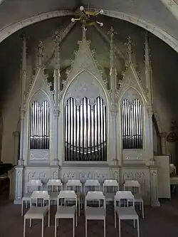 Johann Georg Förster erhielt 1866 den Auftrag für einen Orgelneubau, der nach dem Kontrakt spätestens im August 1868 fertiggestellt werden sollte. Förster begann aber erst im Mai 1870 mit der Aufstellung der heutigen Orgel (Opus 30), die am 26. Juni 1870 abgenommen wurde und 4000 Gulden kostete. An den Chor wurde ein Balghaus für die Windversorgung angebaut. Der neugotische Prospekt ist dreiteilig, mit Spitzgiebeln, Fialen und Kreuzblumen. Eine Besonderheit unter den Registern stellt die Physharmonika dar.[33] Im Zuge von Reparaturverträgen in den Jahren 1888 und 1892 veränderte Förster die Disposition leicht. Im Jahr 1917 musste der zinnerne Prinzipal 8′ aus dem Prospekt an die Rüstungsindustrie abgeliefert werden und wurde 1920 durch Zinkpfeifen ersetzt. Auch die Trompete 8′ ging verloren. 1936 wurde ein elektrisches Gebläse angeschlossen und 1955 eine Überholung der Orgel durchgeführt. Im Jahr 1974 folgte eine Rekonstruktion der beiden verlorenen Register durch Förster & Nicolaus Orgelbau, nachdem sie die Orgel in den Jahren 1969 bis 1973 ins nördliche Querschiff umgesetzt hatten. Ansonsten ist das Instrument einschließlich der seltenen Physharmonika original erhalten. Die Disposition lautet wie folgt:[34]