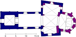 Westturm, Lang- und Querhaus entstanden im 12. Jahrhundert in drei Bauphasen;[7] hierauf weisen die unterschiedlichen Mauerstärken hin. Zu Beginn des 14. Jahrhunderts wurde die ursprüngliche romanische, halbrunde Apsis durch einen polygonalen Chor ersetzt. Das Oberteil des Turmschaftes und das Turmdach wurden in spätgotischer Zeit gebaut und in das Lang- und Querhaus steinerne Kreuzgratgewölbe eingezogen, die außen durch Strebepfeiler abgestützt wurden.